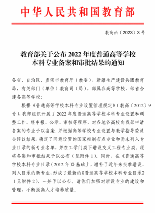 近日,教育部印发了《关于公布 2022 年度普通高等学校本科专业备案和审批结果的通知》(教高函〔2023〕3 号),开车动漫 获批智能建造本科新专业。
