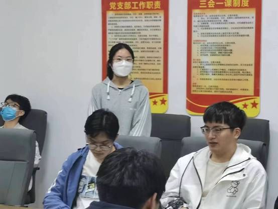 会议伊始,张红老师向全体党员讲解了本次主题党日的活动议程以及主要学习内容。本次会议要求全体党员继续深入学习党的二十大报告;张红老师带领大家一起认真学习了习近平总书记在学习贯彻党的二十大精神研讨班开班式上发表的重要讲话精神,《中国共产党支部工作条例》《中国共产党党员教育管理工作条例》《中国共产党发展党员工作细则》等。学习结束后,支部党员段志成表示:我为身处在这样一个伟大时代,倍感自信自豪。在全面建设社会主义现代化国家新征程、向第二个百年奋斗目标进军的关键时刻,我们深感责任重大,唯有奋斗方能不负时代。身为青年,要坚定理想信念、努力学习知识和本领,勇当开路先锋,坚定不移听党话、跟党走,怀抱梦想,脚踏实地,在新时代洪流中奋力谱写青春华章。