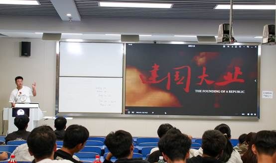 观影开始前,刘老师向新生们简单介绍了电影的梗概和历史背景。电影《建国大业》主要讲述了从1945年抗日战争结束到1949年中华人民共和国成立前夕过程中发生的一系列故事,依次展现了重庆谈判、渡江战役、开国大典等具有重大历史的事件,反映了中国共产党和中国各民主党派在反对国民党的斗争中,风雨同舟、团结奋斗,为建立多党合作和政治协商制度所经历的曲折艰辛,直至取得最后胜利的光辉历程。