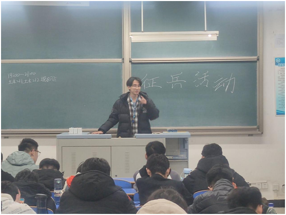 各班班委向同学们讲述了关于大学生应征入伍待遇的规定和讲述征兵的意义,充分调动同学们报名应征的积极性,并向同学们详细地解释了征兵的各项条件包括征集对象和范围、男兵女兵的文化水平要求、入伍年龄要求、基本自身条件、基本政治条件等。随后,讲解了征兵的相关优待政策,包括有关经济优待的政策、退伍士兵复读复学和就业政策、应征普通高等学校录取新生保留入学资格和退役后入学方法,应届高等毕业生在学校所在地入伍,有关政策等。