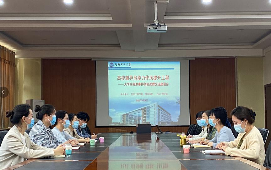 为充分提升辅导员育人能力和水平,提高辅导员应对突发事件的综合管理水平和应急处理能力,保障在校大学生的安全稳定,落实立德树人根本任务,发挥辅导员思想政治教育的基础性作用,土木工程学院联合信息工程学院、河洛书院于2022年4月8日在工科2号楼308会议室了举办了大学生突发事件危机处理交流座谈会,学院专职辅导员和学生干部代表参加了本座谈会。
