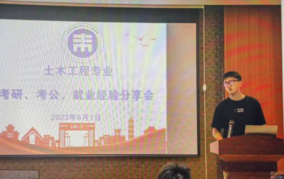 优秀毕业生代表段志成(考研重庆大学)为大家详细介绍了有关考研的网站、公众号、APP等,针对数学和专业课悉心整理了学习方法和推荐课程,也为考研的同学指明了方向;黄存雨结合自身考公,考选调生经验,给同学们详细分析了考公做题方法和复习计划;陈继鹏(签约中建三局)就面试公司的选择、面试简历的制作、以及面试时的心态三方面问题进行了详细的讲述。