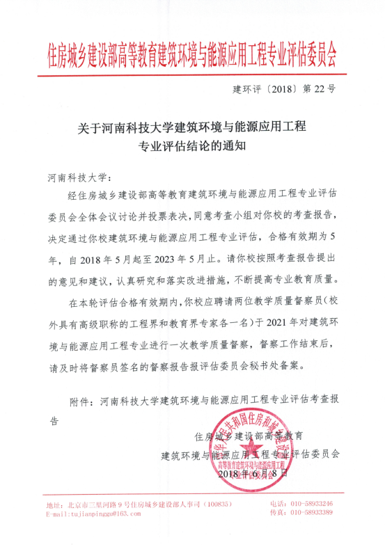 建筑环境与能源应用工程专业评估,合格有效期为5年,自2018年5月起至2023年5月止。我校建筑环境与能源应用工程专业成为全国200余所设有本专业的高校中,通过评估的第40所高校之一,也是河南省第三所通过建筑环境与能源应用工程专业评估的高校之一。