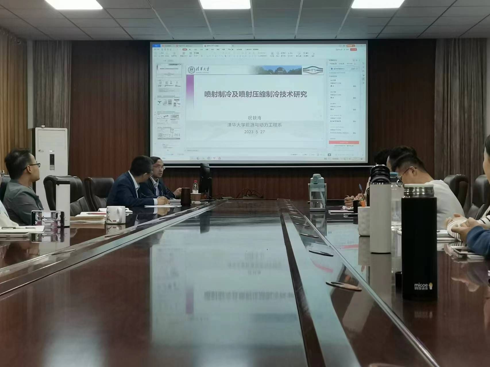 祝银海首先介绍了余热驱动制冷系统的能效提升对于“双碳”目标的实现意义重大,针对喷射器的运行流动机制及其性能提升和调控、不同运行条件下喷射制冷系统的全工况高效、灵活、安全、环保运行的关键科学问题,从喷射器的准二维建模方法、喷射器非结构化优化方法、跨临界喷射式制冷、跨临界CO2喷射压缩制冷、跨临界喷射-布雷顿循环冷电联供等方面阐述了课题组最新研究进展,并结合国家科技重大专项介绍了喷射制冷技术的工程示范项目应用情况。报告会后,祝银海就相关的科研问题与在座师生进行了讨论和交流,并参观了我校建筑能源与热科学技术研究所搭建的喷射制冷实验系统。