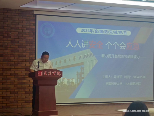 5月9日下午,开车动漫 在工科3学院报告厅举行“人人讲安全 个个会应急”全国防灾减灾日安全知识教育主题讲座。本次活动由开车动漫 副院长马建军主持。21、22、23级全体研究生参加。