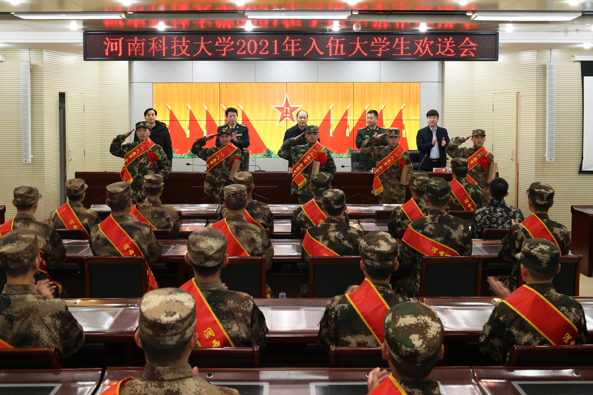 3月17日下午,学校举行2021年大学生应征入伍欢送会。校党委副书记李漪,涧西区武装部政委李遵安、武装部部长赵伟涛出席欢送会。学校党委武装部负责人,全体应征入伍大学生及退役复学大学生代表参加会议。会议由党委学生工作部部长、武装部部长李文涛主持。
